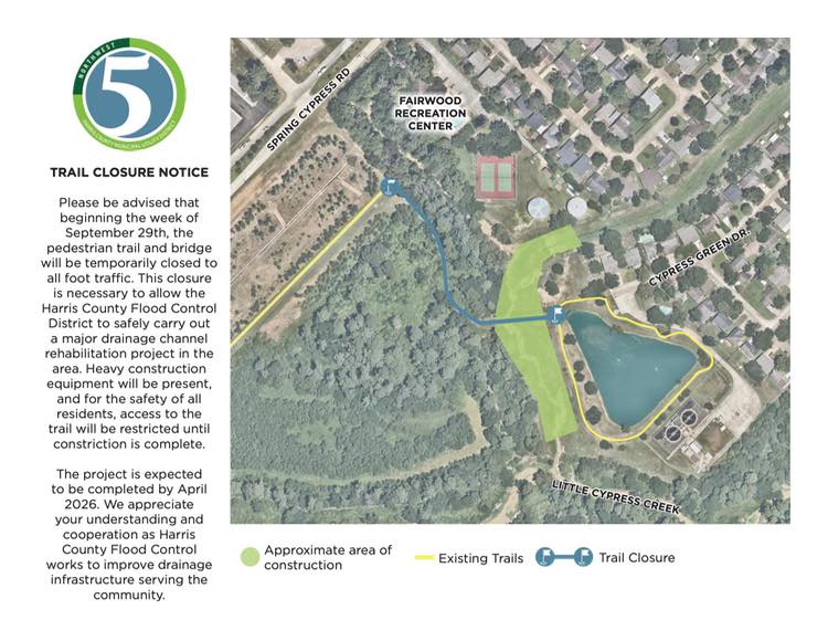 Please be advised that beginning the week of September 29th, the pedestrian trail and bridge will be temporarily closed to all foot traffic. This closure is necessary to allow the Harris County Flood Control District to safely carry out a major drainage channel rehabilitation project in the area. Heavy construction equipment will be present, and for the safety of all residents, access to the trail will be restricted until constriction is complete.
